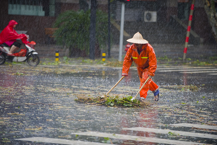 暴雨中,城區大街小巷雨水橫流,部分主次干道積水嚴重。環衛工人冒著大雨,不顧汽車濺起的臟水,積極清理和疏通路面積水,確保大街小巷排水暢通。許多低洼路段的環衛工更充當起排水工。