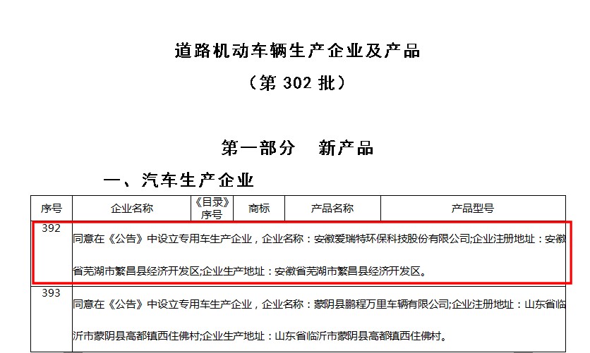 2017年獲國家工信部頒發(fā)“專用車生產(chǎn)資質(zhì)”愛瑞特產(chǎn)業(yè)園建成投產(chǎn);形成年產(chǎn)新能源環(huán)衛(wèi)車3萬臺、產(chǎn)能達20億規(guī)模專用汽車生產(chǎn)企業(yè);2018年公司正式更名為“安徽愛瑞特新能源專用汽車股份有限公司”