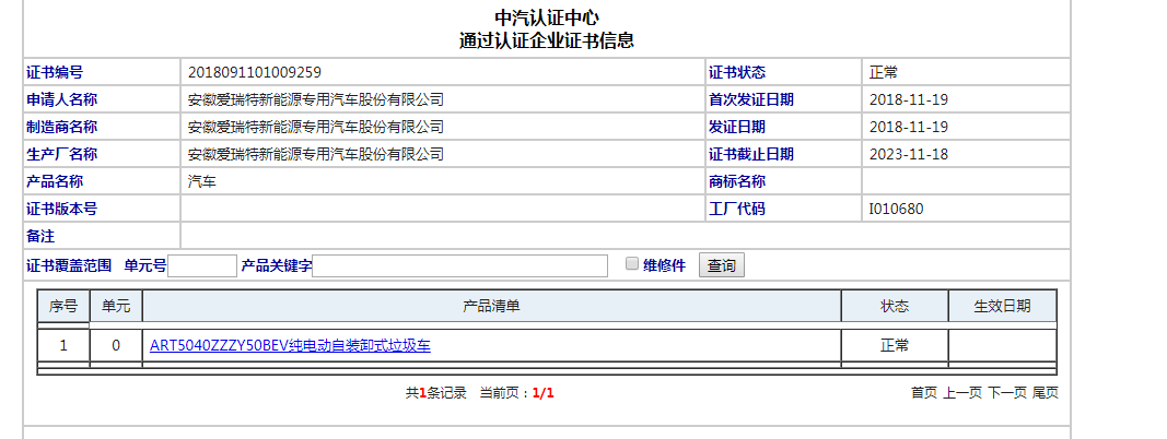 近期,經中汽認證中心認證,安徽愛瑞特新能源專用汽車股份有限公司(以下簡稱愛瑞特)旗下ART5040ZZZY50BEV車型通過強制性產品認證,即國家3C認證,取得了該領域市場的準入資格。這標志著愛瑞特研發的新能源環衛專用汽車在新能源汽車行業前進了一大步,正式邁入批量生產、投放市場階段。ART5040ZZZY50BEV型純電動自裝卸式垃圾車節能減排、經濟實用、操控簡單,起步快行駛穩定,噪音低安全性高,既為城市垃圾清潔行業降低了運營成本,又減少了城市空氣污染指數;既提升了城市居民的生活質量,又推進了綠色城市的健康建設。